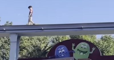 John then quickly jumped onto the roof of a concession stand and then jumped on the monorail.