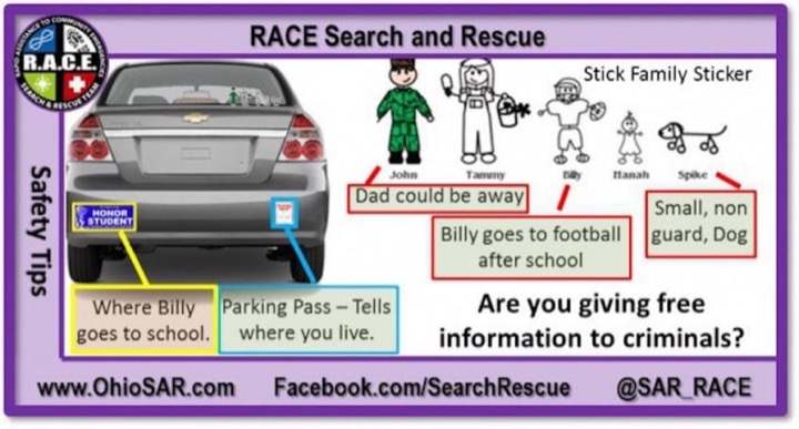Bumper stickers have long been a popular way to add some personality to a vehicle. But believe it or not, those handpicked decals may actually be putting you and your family at risk! [rsnippet id="2" name="ArticleAd-300x250-3"] Credit: familystickers.com Gone are the days where bumper stickers were nothing more than catchy phrases. Now it's all about personalization. You can find stickers to represent just about any aspect of your life: your job, your favorite vacation spot, your breed of pet, the school your kids attend, and so on. There's even super cute stick family decals to represent each member of the family! Credit: familystickers.com It's easy to see why all this customization has become so popular. It's a great outlet for self-expression. The trouble is, it's also a great way for complete strangers to learn intimate details about your life. . . without you even realizing it! And there's no telling just what those strangers may be planning to do with that information. Search and Rescue Ohio has a picture that helps illustrate this very real danger. In the bumper stickers shown below, potential burglars could easily get a lot of intel is just a matter of minutes. Credit: RACE Search and Rescue Ohio The family stickers reveal that dad is a military man, meaning he could be away a lot. The honor student sticker shows where Billy goes to school, and his football uniform suggests he may have practices and games. And despite giving the family dog the tough name of "Spike," the bumper sticker instantly gives away that he's a small dog not likely to deter a determined crook. RELATED: Mom's warning to others after a scary encounter at the grocery store When you look at the bumper stickers from this perspective, it's quite eye-opening! And that's exactly why Search and Rescue Ohio posted it!"Our goal is that everyone thinks about the free information that they are providing to potential criminals," RACE Search and Rescue said. "Our families' safety is the most important thing."It's not to say you have to get rid of your bumper stickers all together. Just be mindful of the ones you select, and just how much information they are giving away!
