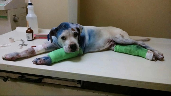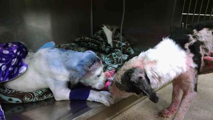 If you've ever wondered if animals are capable of compassion, a photo has gone viral that answers that question with a resounding YES! In it, a severely abused puppy named Sammie is being treated for injuries sustained from a level of animal cruelty that's unfathomable. But another shelter dog, Simon, is there to remind him (and us) that love and compassion have the power to outshine the evil in this world! Credit: Facebook / Rescue Dogs Rock NYC ***WARNING: Some of the images are graphic in nature*** Sammie is a 5-month-old Boxer mix who was rescued by the NY based animal rescue, Rescue Dogs Rock NYC, via their South Carolina vet partner. A stranger dropped the stray dog off on the verge of death, and it's estimated the dog suffered the brutal attack several days before he was brought in. Credit: Sammie's You Caring page Sammie's wounds were extensive and a result of being spray painted, shot in the head and dragged behind a car. It's one of the most horrific cases of abuse the rescue organization has ever seen. [rsnippet id="3" name="Article-Ad"] The kind humans at the vet immediately sprang into action, trying not only to save the poor dog, but also to show the severely abused puppy that the evil he'd already encountered in his short life was not all that existed -- that there was love in this world, too. But that message was best delivered by a 1-year-old Border Collie mix and fellow rescue dog, Simon. He, too, had endured abuse at the hands of humans. But he'd also experienced compassion from the humans at another animal shelter who'd rescued him. RELATED: Abuse left this pup with only half a face, but she still has a heart full of love Simon was suffering from a bad case of the skin disease, mange, and was being treated at the same vet as Sammie. Simon heard the cries of the severely abused puppy from his kennel. Credit: Sammie's You Caring page As soon as Simon was let out, the concerned dog went straight to the x-ray table where Sammie lay, and put his paw on the table. Next, the two touched noses and a stunning friendship was instantly forged. The beautiful moment was caught on camera and shared on Facebook, where it soon went viral."The picture really speaks for itself," said Stacey Silverstein, the cofounder of Rescue Dogs Rock NYC. "You can see Simon comforting Sammie. It shows that animals have compassion and they feel. Simon would go to Sammie's kennel to comfort him and play with him and sit with him often."Credit: NBC 12 From there, the special bond only strengthened, with Simon acting as Sammie's caretaker. He would go to see Sammie at his kennel often, and the visits were a frenzy of happy tail wagging! Watch the two pals in the video below: The attention Sammie and Simon's precious photo received resulted in a massive outpouring of love and support. And thanks to that, the fundraising goal set up for Sammie's medical treatment was not only met, but exceeded! RELATED: The internet rallied behind this abused pup and her recovery Sammie has undergone the first of his surgeries, which lasted more than 3 hours. But with his head stitched up and his hurt legs healing, so far Sammie's showing great signs of improvement. Credit: Facebook / Rescue Dogs Rock NYC Sammie still has a long road to recovery before he can be adopted. But now he's got a fighting chance, as well as a foster home to provide the love and security he needs to focus on getting better! [rsnippet id="2" name="ArticleAd-300x250-3"]