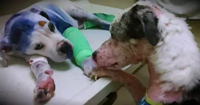 Shelter Dog Comforts A Severely Abused Puppy Before Surgery