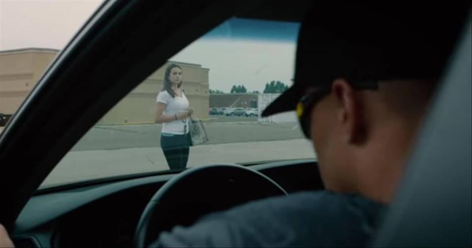 The scene starts off with a girl walking out of a building to her car while she is looking down at her phone. Then a man sees her and gets out of his car. He then comes up from behind her and grabs her as she screams, and he puts her in the trunk of his car before driving away.