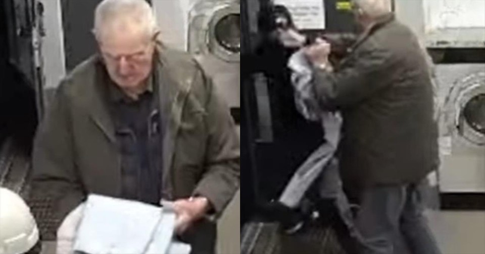 The situation, which appears to take place in a laundry mat, begins with the man trying to fold his clothes. Moments into the clip, a young man dressed in black from head to toe rushes into the establishment and quickly approaches the elderly gentleman.