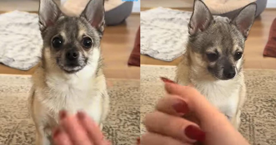 She repeatedly asks the animal for his paw, but it doesn’t work. The pup walks away and leaves her hanging without a paw in the palm of her hand.