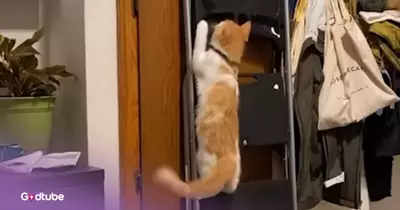 This cat loves climbing, and apparently, also enjoys stealing. The feline, who has a fascination with getting to and being in elevated places, hilariously harbors more nefarious interests. Watch this short but hysterical clip to see how this cat combines two of its biggest interests.