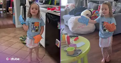 In the clip, a little girl is incredibly excited and overjoyed to show her mother her kitchen setup. Of course, the child’s kitchen is much smaller than the actual kitchen, consisting of only one table with several items resting on top of it. But then the little girl directs her mother’s attention to one item in particular. It appears to be a toaster with some knives in it. The mother is likely confused about what her daughter is trying to do. Why has she chosen such a dangerous way to decorate her kitchen?