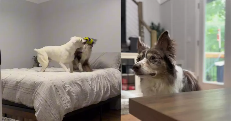 In the video, two canines are having the time of their lives playing on a bed when they suddenly hear a familiar sound. It’s that of someone pulling and tearing a plastic wrapper. Of course, both dogs instantly believe a treat is in their near future. So, believing this to be the case, they go hunting for the source of the noise.