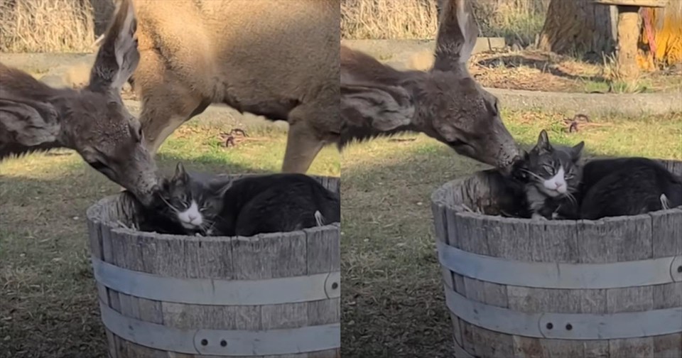 A clip posted on social media captures a moment—a situation that no one could have predicted or guessed. The video shows a deer lovingly giving a bath to a black-and-white cat who is lounging in an empty flowerpot.