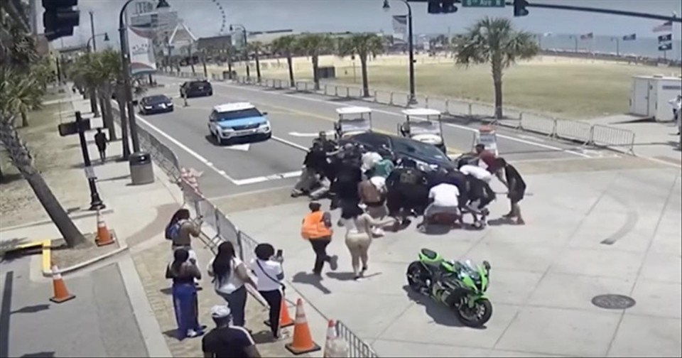 Twenty people rush to lift a car off of a motorcyclist, Alex James. He had been out riding in Myrtle Beach, South Carolina when a distracted driver hit him from behind. This heart-stopping video will restore your faith in humanity that there are good samaritans out there.