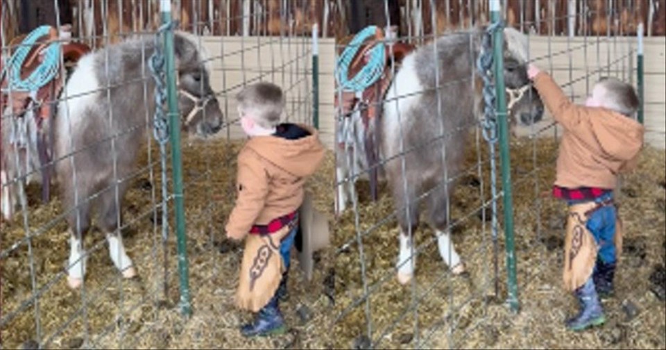 The short 18-second clip starts with a child, likely not older than 3 or 4, standing next to a pony’s stable. The child is dressed head to toe as a cowboy. He even has the cutest little hat! The little guy removes his 12-gallon hat to make the pony aware of his haircut.