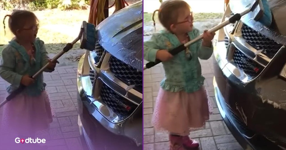 As the video begins, the mother comes across the empty bottle of bubbles, most of which had ended up on the ground, with the rest on the van. The mom encounters her little girl, who is hard at work cleaning the vehicle.